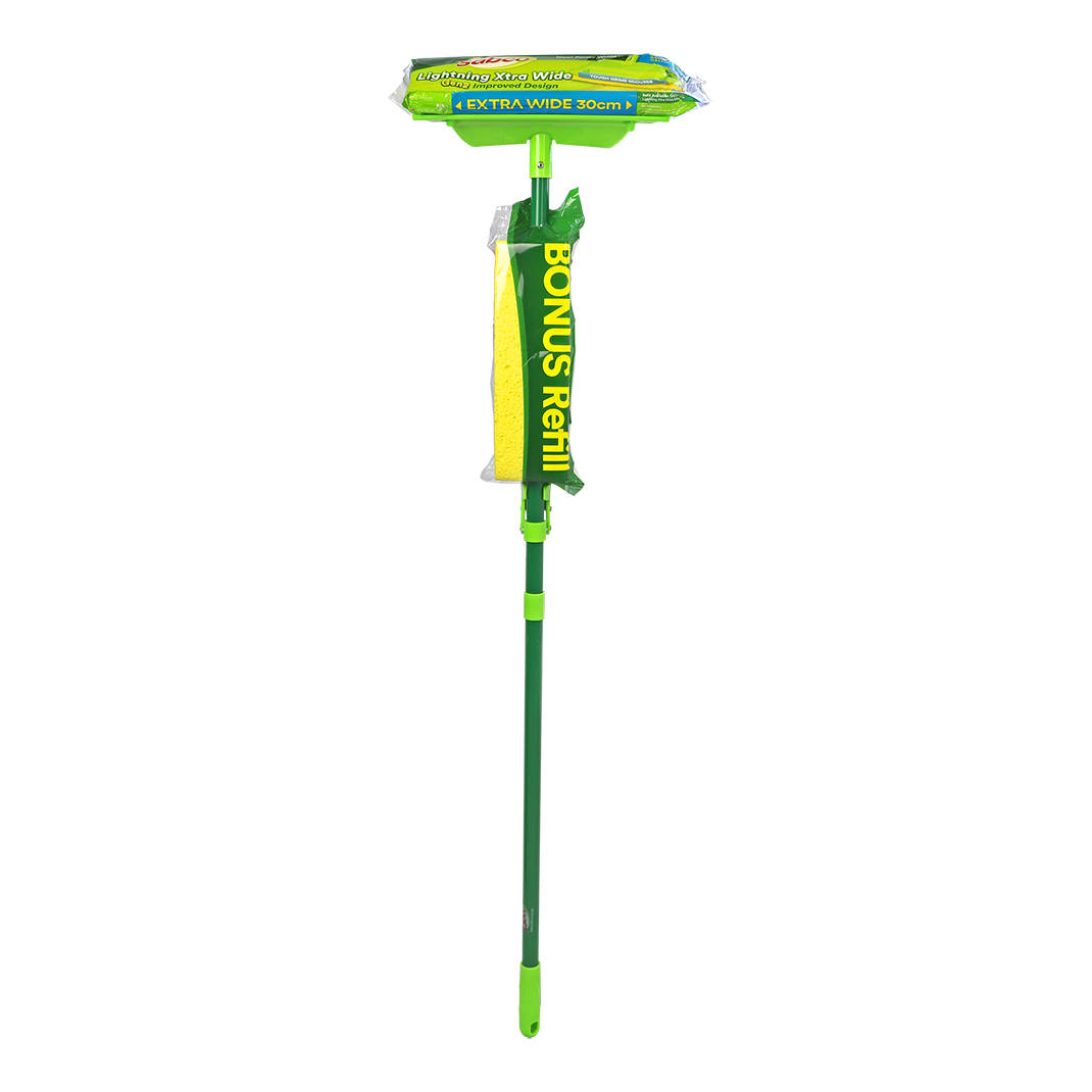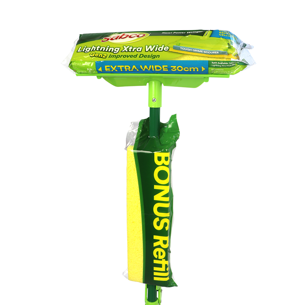 The Sabco Lightning Xtra Wide Gen2 Mop is built for fast, powerful cleaning across all hard floor surfaces. Its 30cm premium cellulose sponge delivers superior absorbency and wider coverage, while the upgraded POWER wringer squeezes out more water for quicker drying and better results. This Gen2 model includes a bonus refill for added value and extended use. The built-in grime scourer tackles stubborn marks, and the easy pull-to-wring handle ensures ergonomic control. With a quick click-on/off sponge system, changing heads is fast, hygienic, and hassle-free—making this mop a smart, efficient solution for homes and commercial spaces alike.